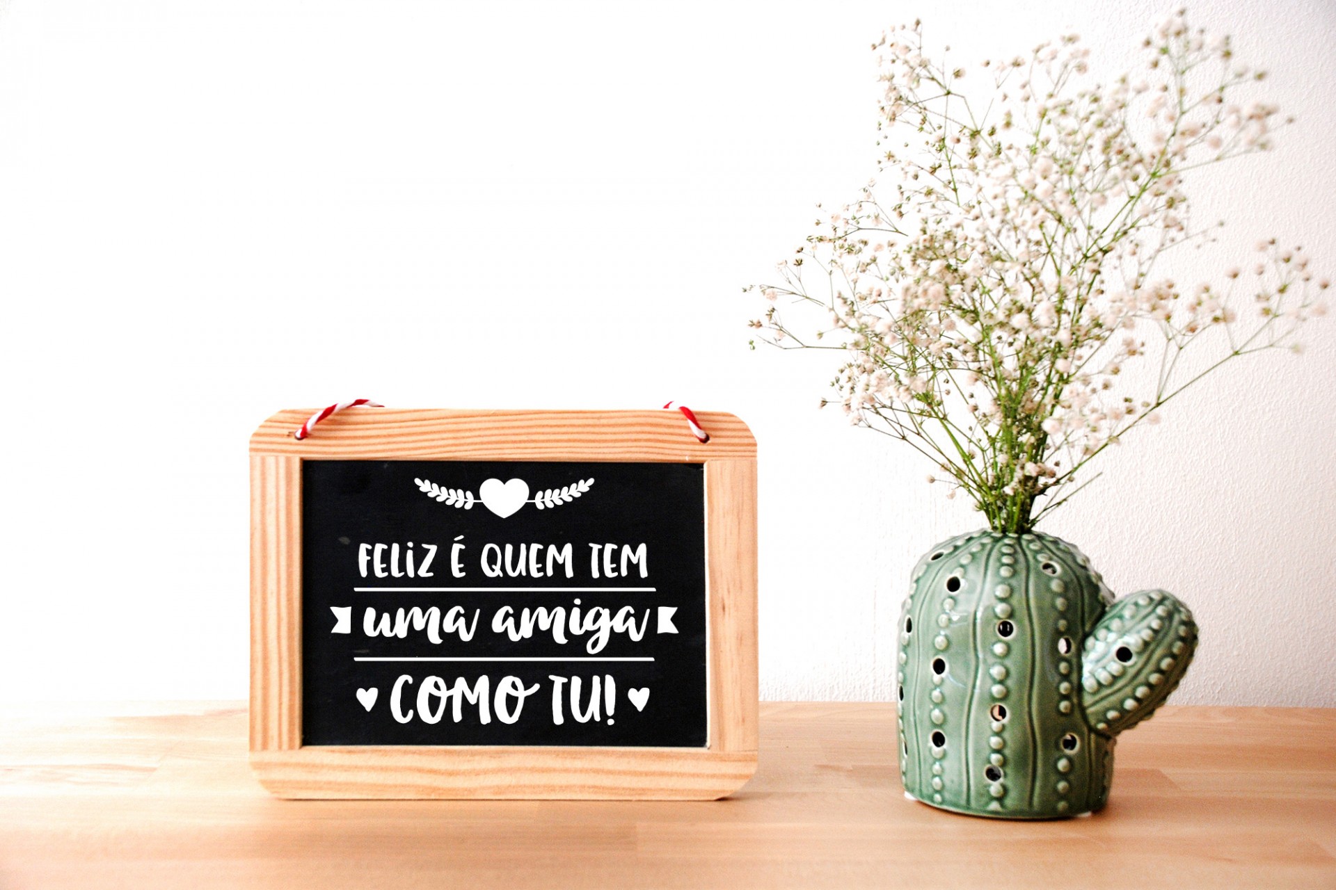Nota: As frases não são escritas a giz, pelo que não existe o risco de se apagarem. Como se trata de um artigo de origem artesanal, podem ocorrer variações na cor da moldura de madeira e na própria lousa da ardósia.