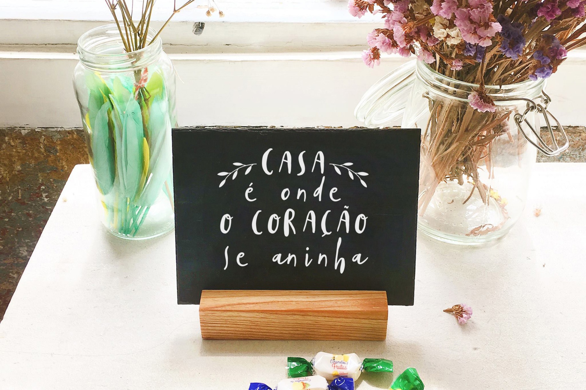 • Placa preta com texto branco apoiada em suporte de madeira, entre frascos de vidro com flores e doces coloridos