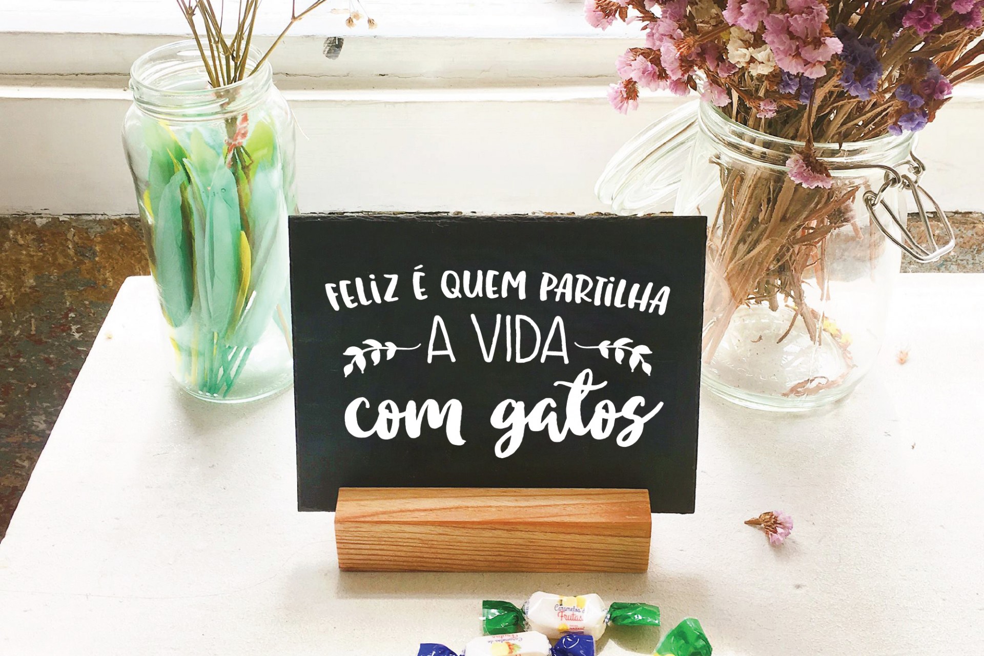 • Placa preta com texto branco sobre suporte de madeira, flores em vasos de vidro e doces numa mesa branca.