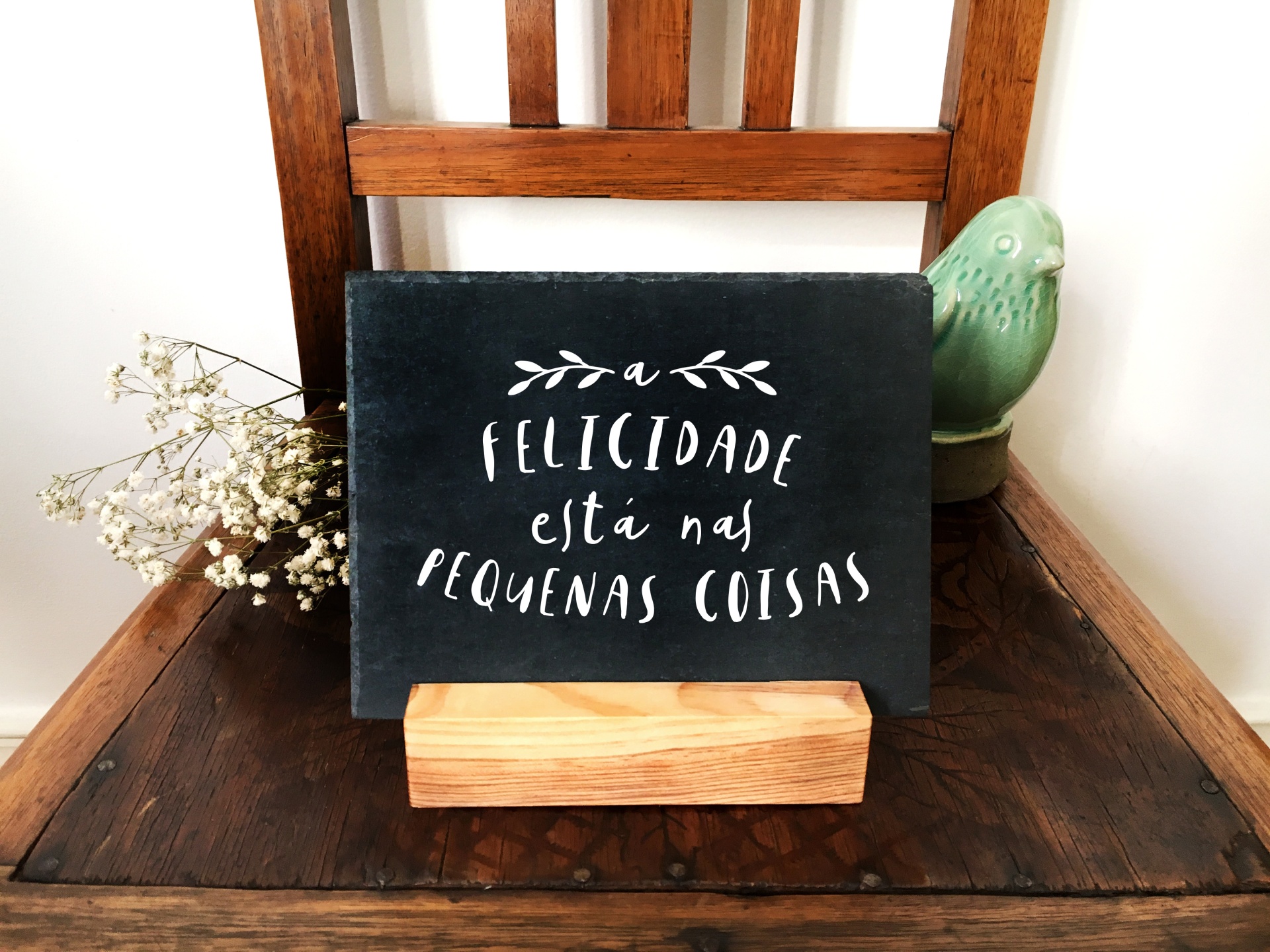 Nota: As frases não são escritas a giz, pelo que não existe o risco de se apagarem. Como se trata de um artigo de origem artesanal, podem ocorrer variações na cor da base de madeira e na própria lousa da ardósia.