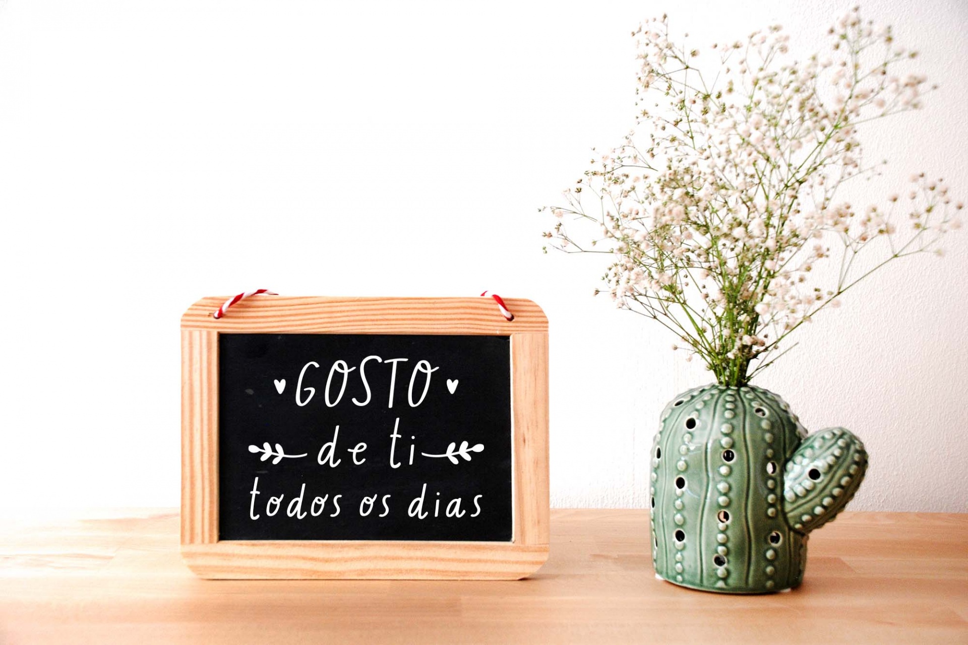 • Quadro de madeira com mensagem em português e vaso verde em forma de cacto com flores sobre mesa de madeira