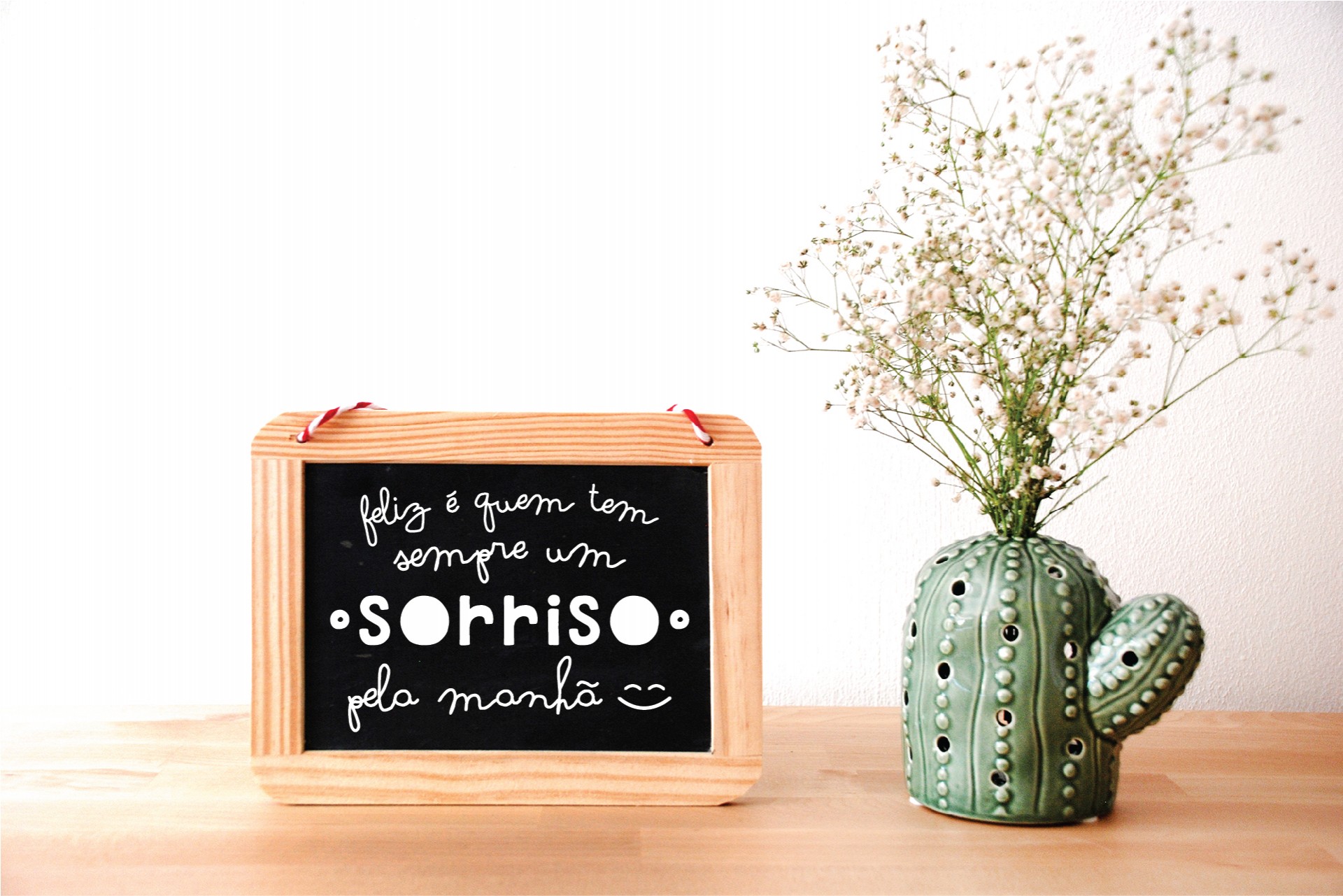 • Quadro de madeira com texto em ardósia preta ao lado de vaso verde em forma de cacto com flores brancas