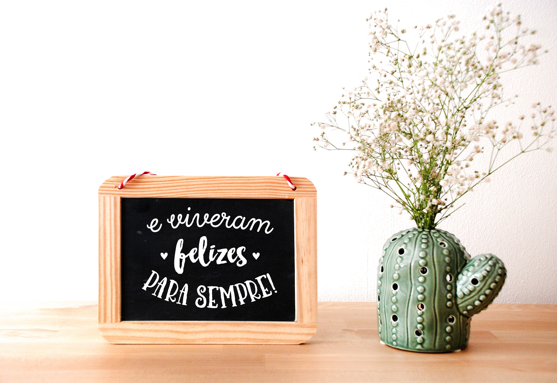Placa decorativa com texto e jarra em forma de cacto com flores secas num fundo claro