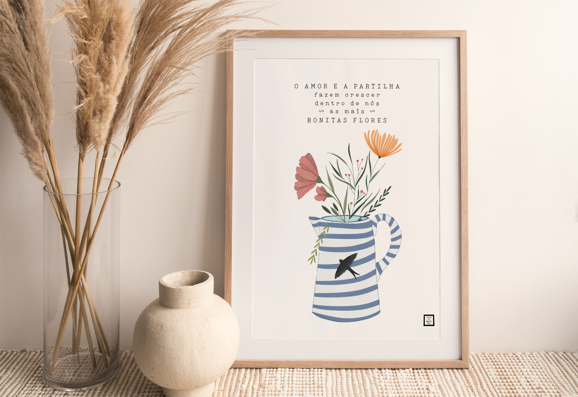• Pôster decorativo com ilustração de flores num jarro azul e branco com texto em português, em ambiente minimalista com vasos e plantas secas.