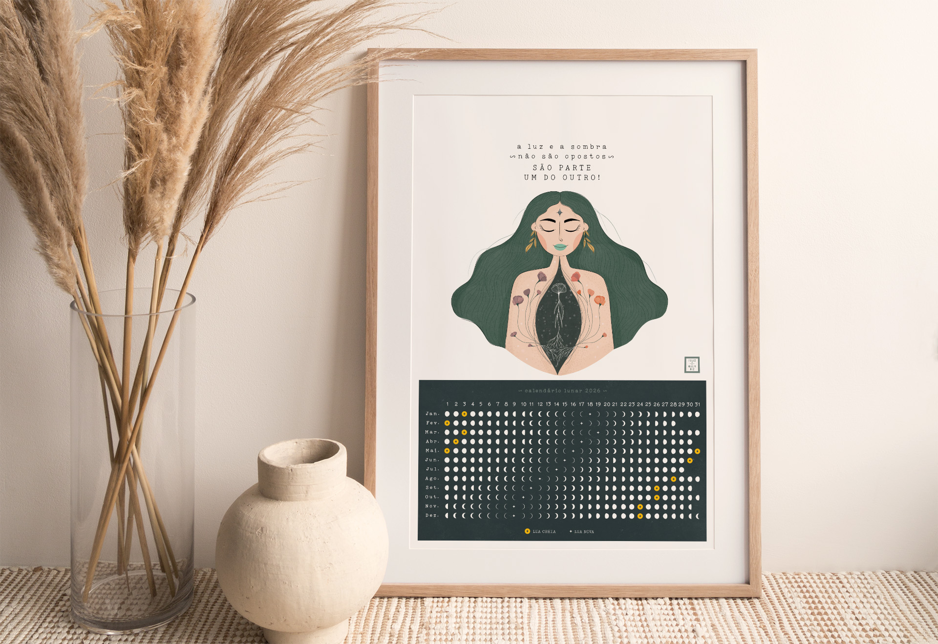 Calendário lunar 2026 5,00 € Desconto de %. IVA incluído. Partilhar Comprar Contactar Calendário lunar em formato A3 (30x42cm) impresso em papel de aguarela de 200g. Ilustração e design original do projecto Feliz é quem diz®. Moldura não incluída.