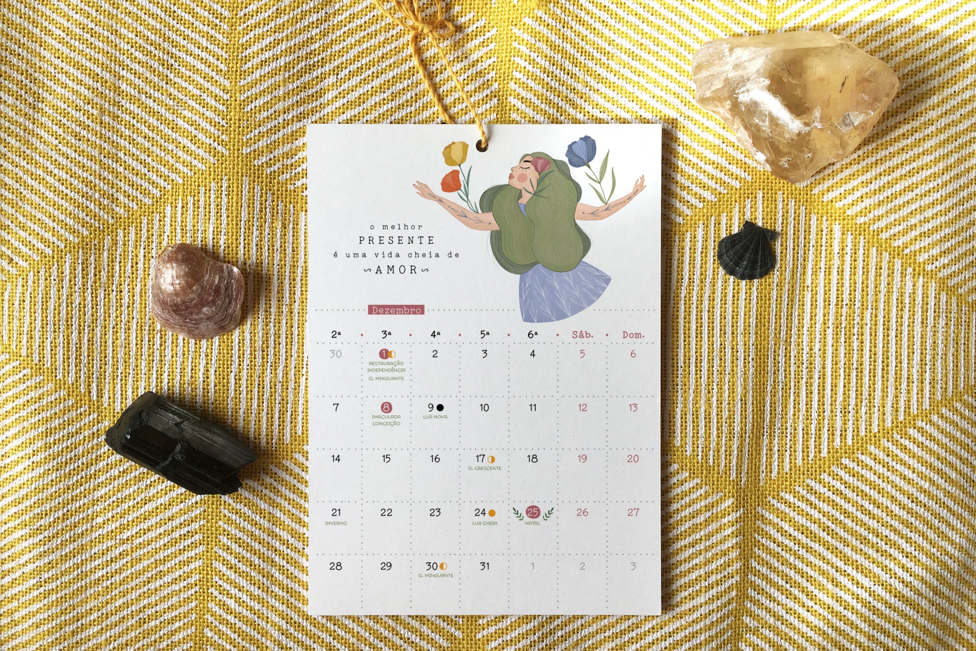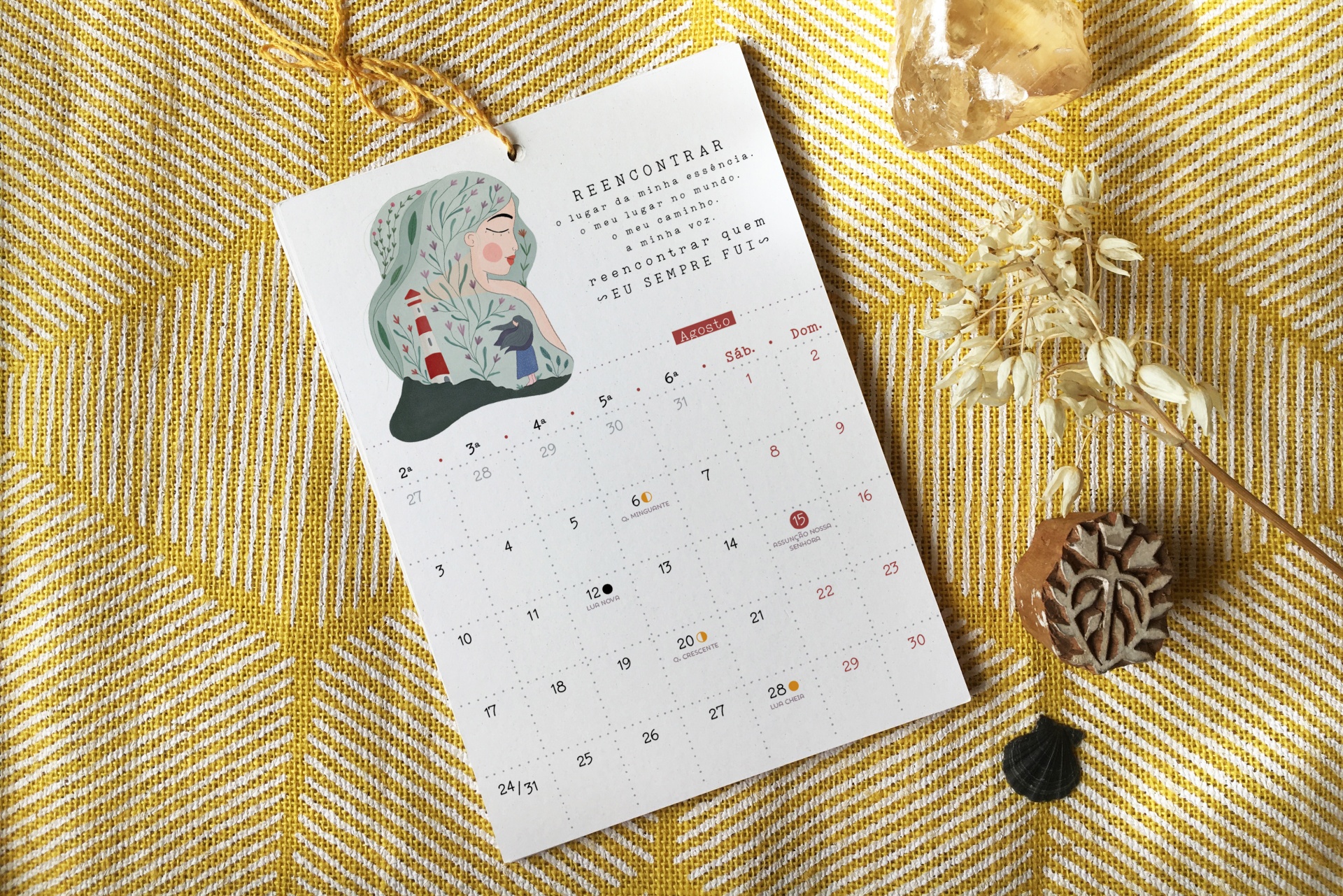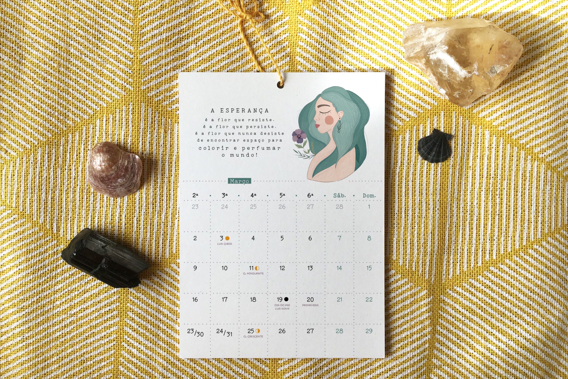 • Calendário de papel com ilustração de mulher e texto em fundo amarelo com pedras