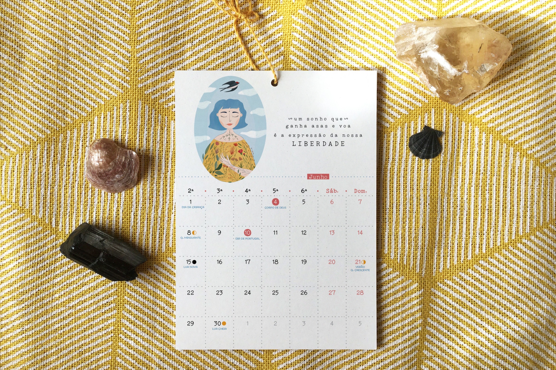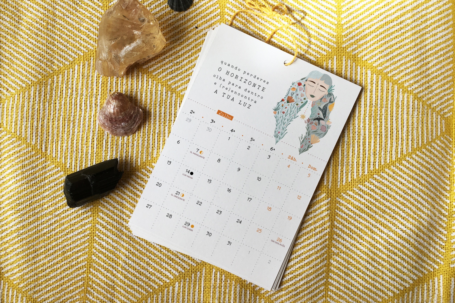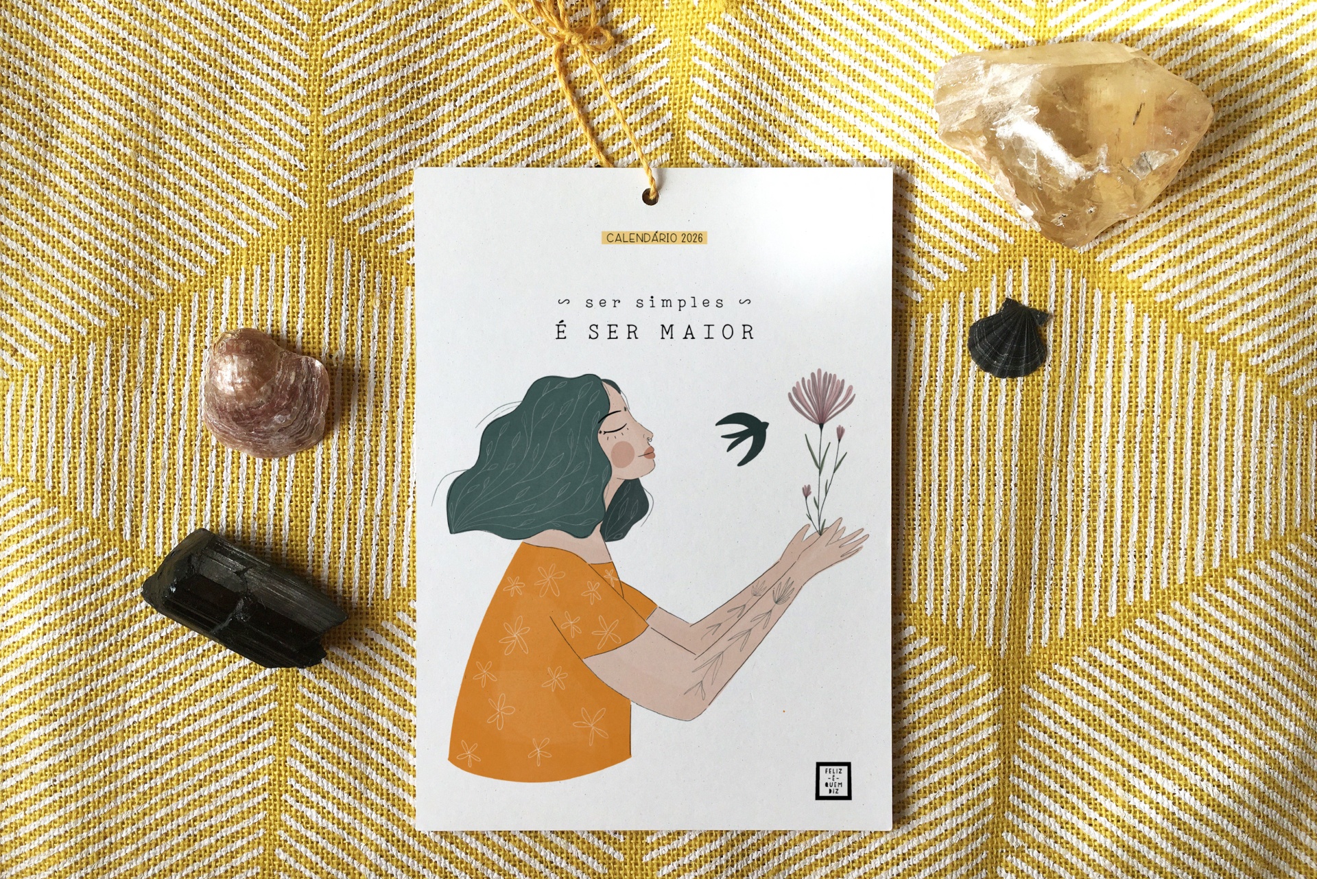 • Calendário de papel com ilustração de mulher e texto em fundo amarelo com pedras
