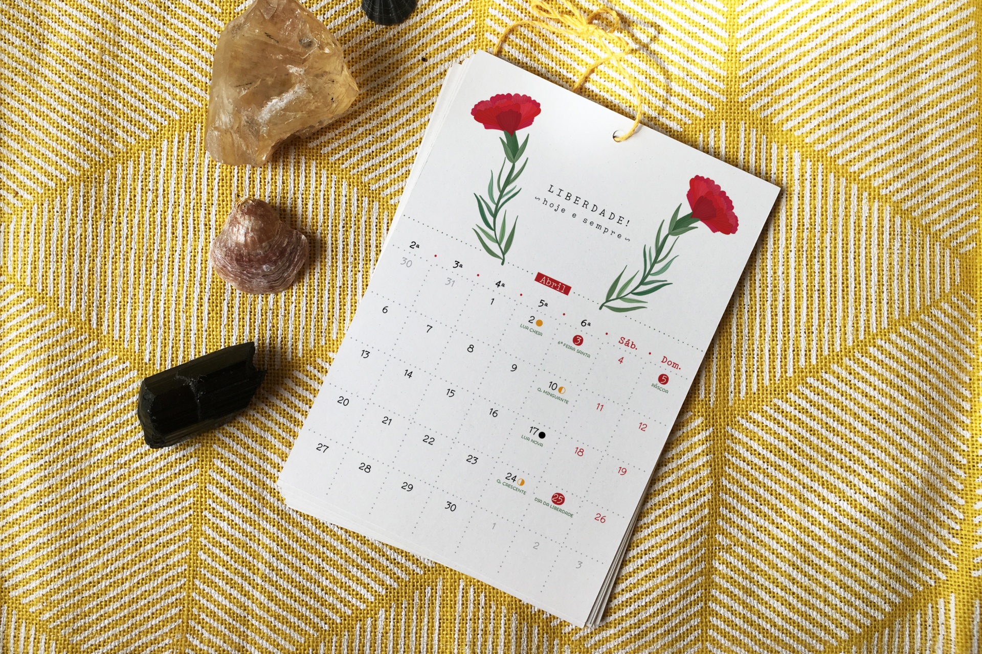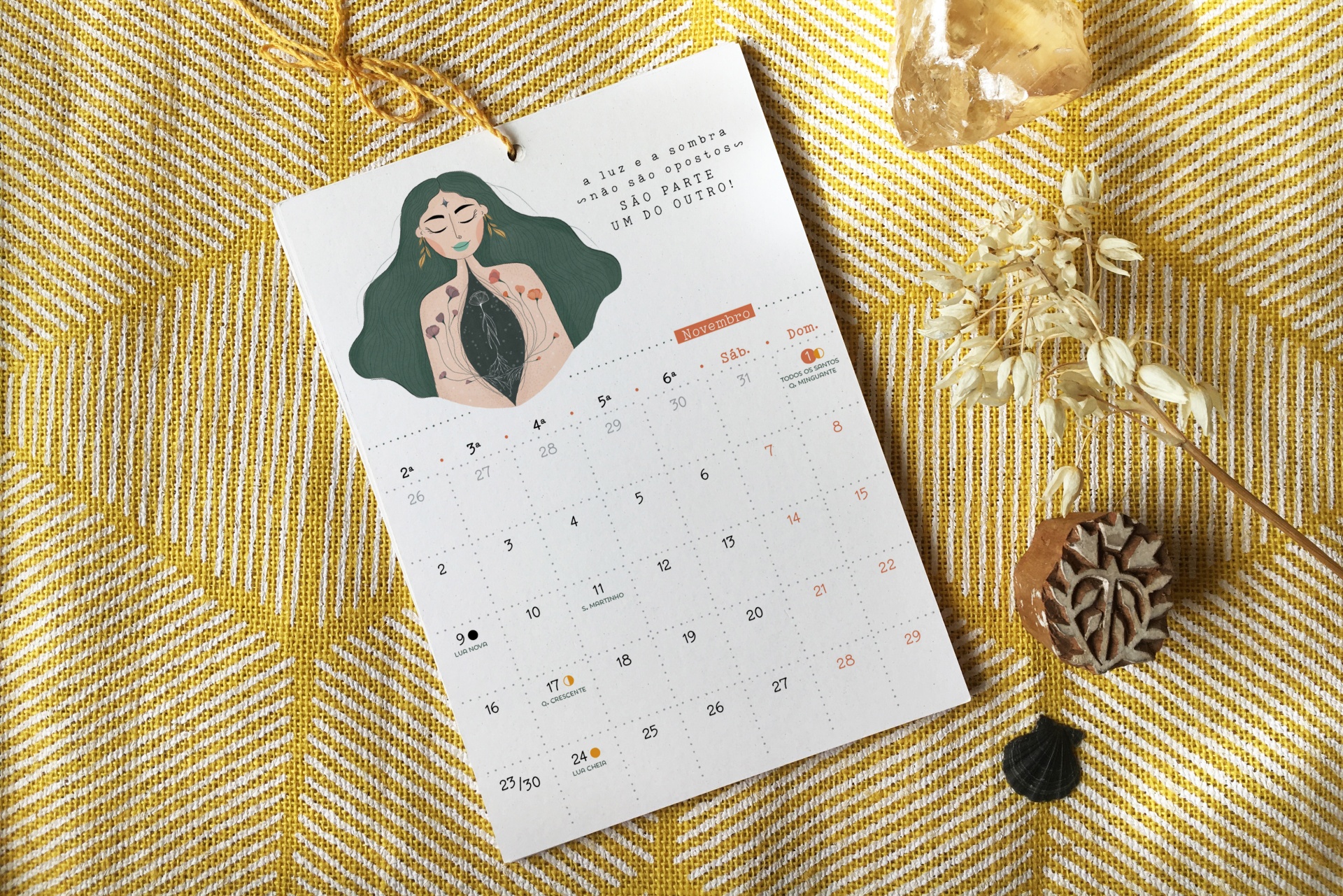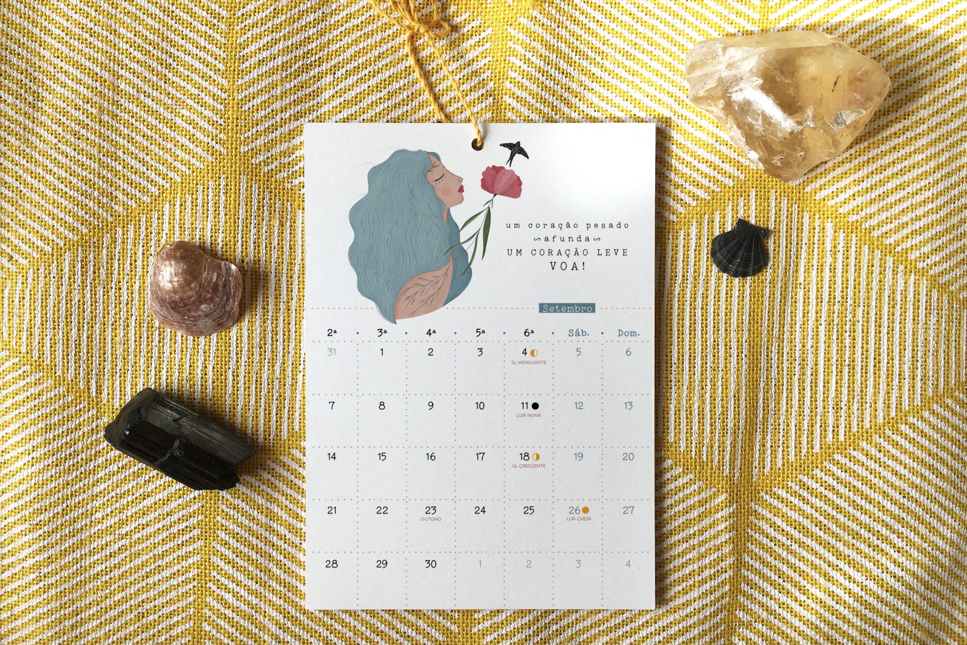 Calendário de papel com ilustração de mulher e texto em fundo amarelo com pedras