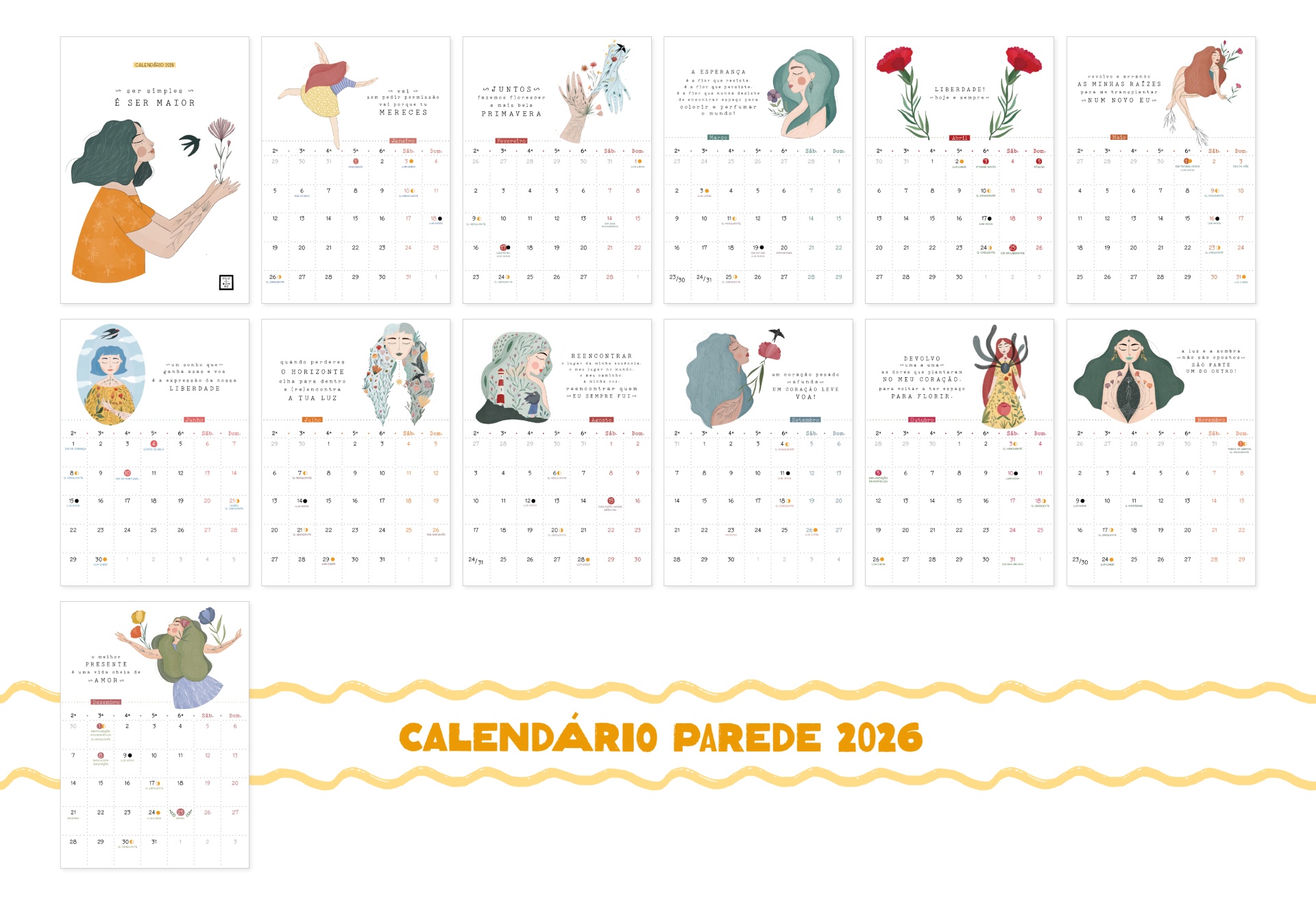 • Calendário de parede 2026 com ilustrações femininas e frases em português