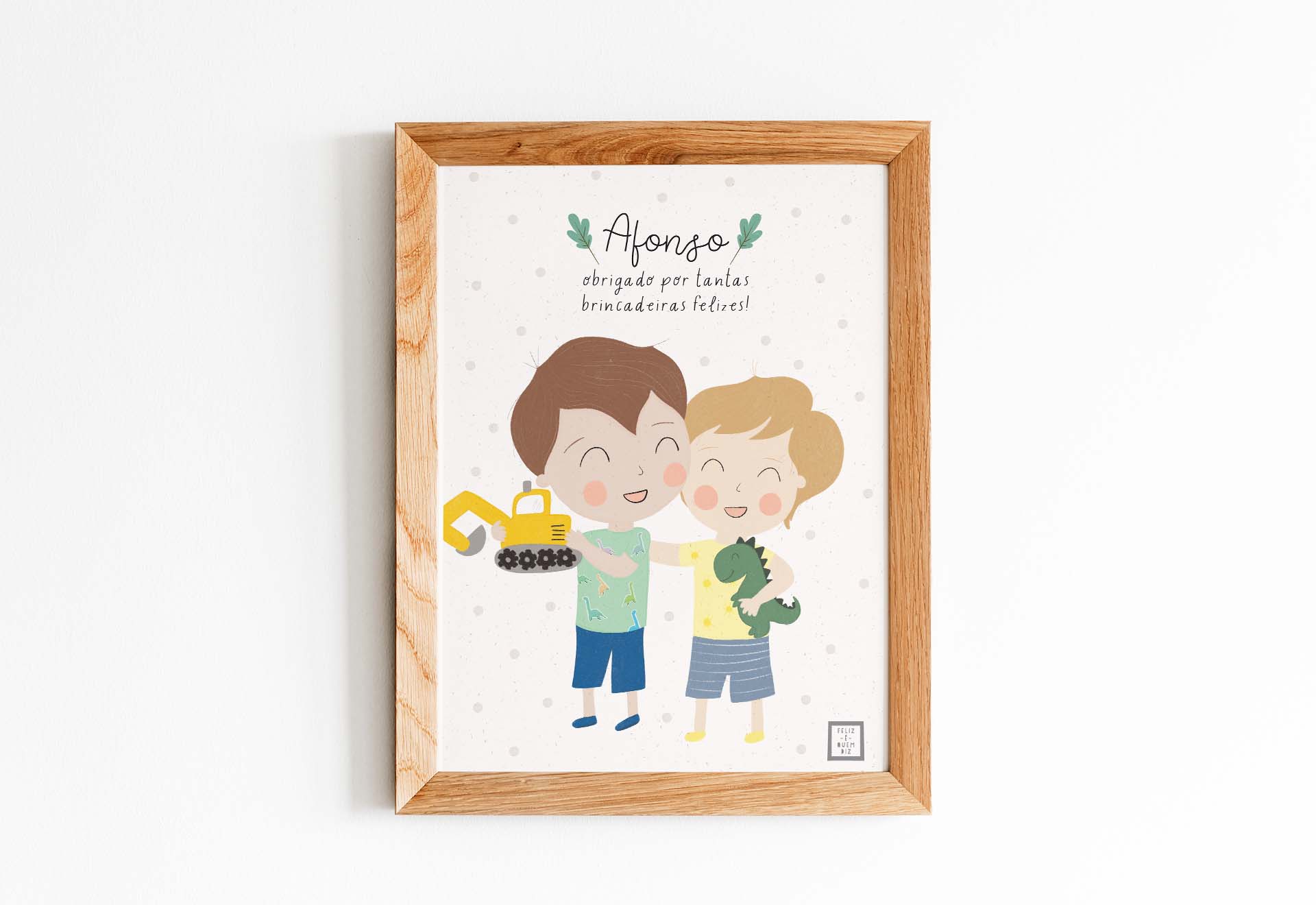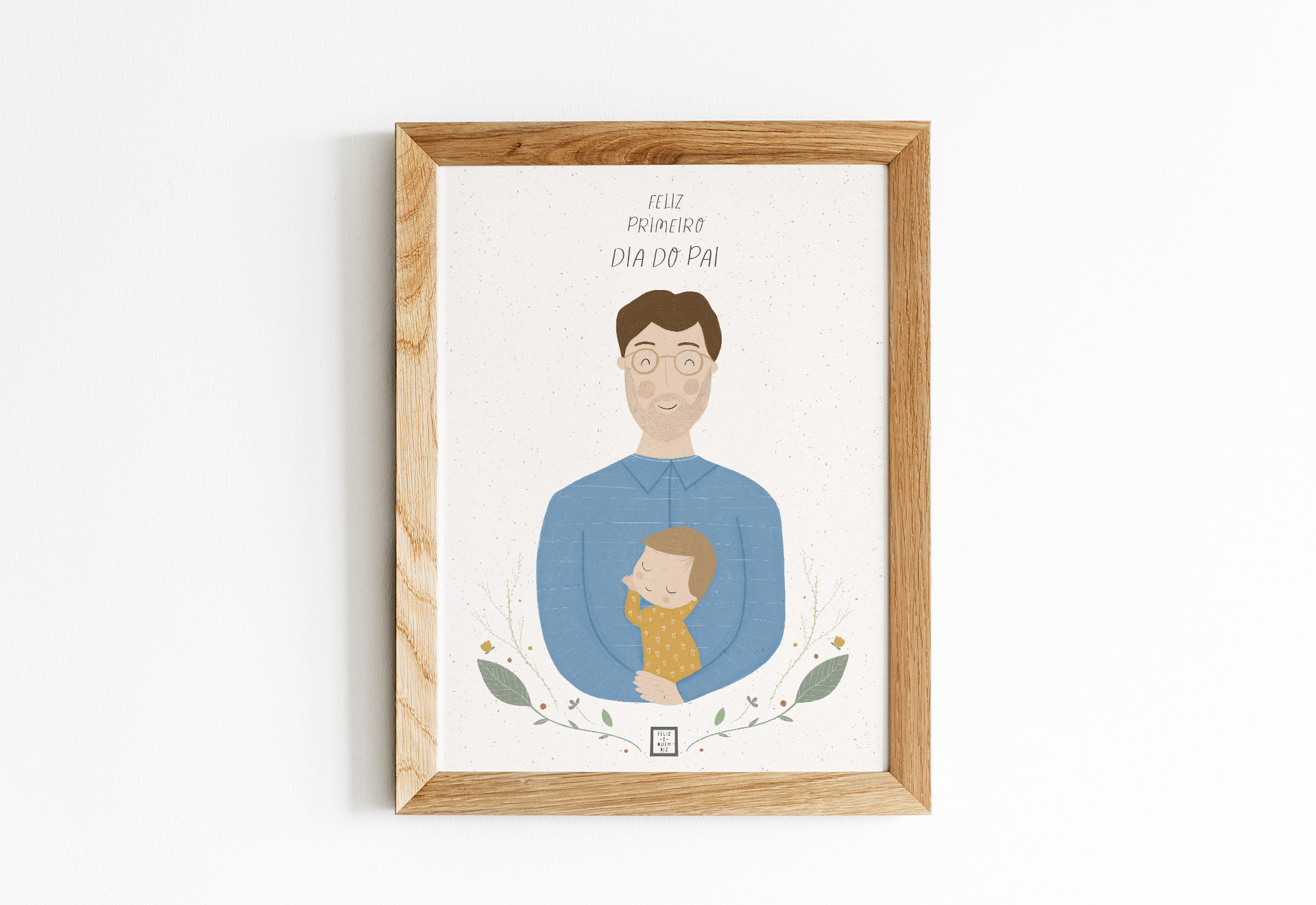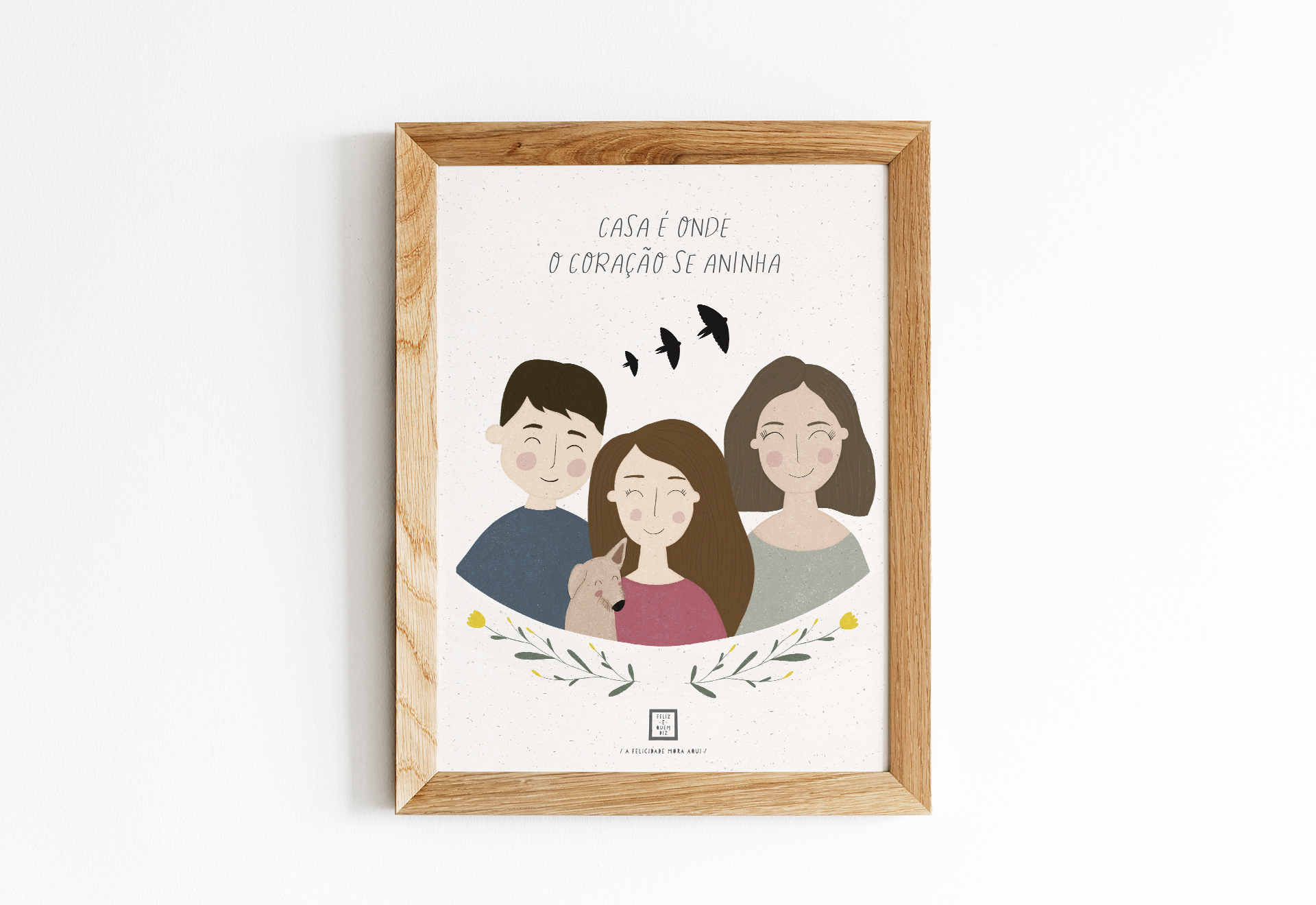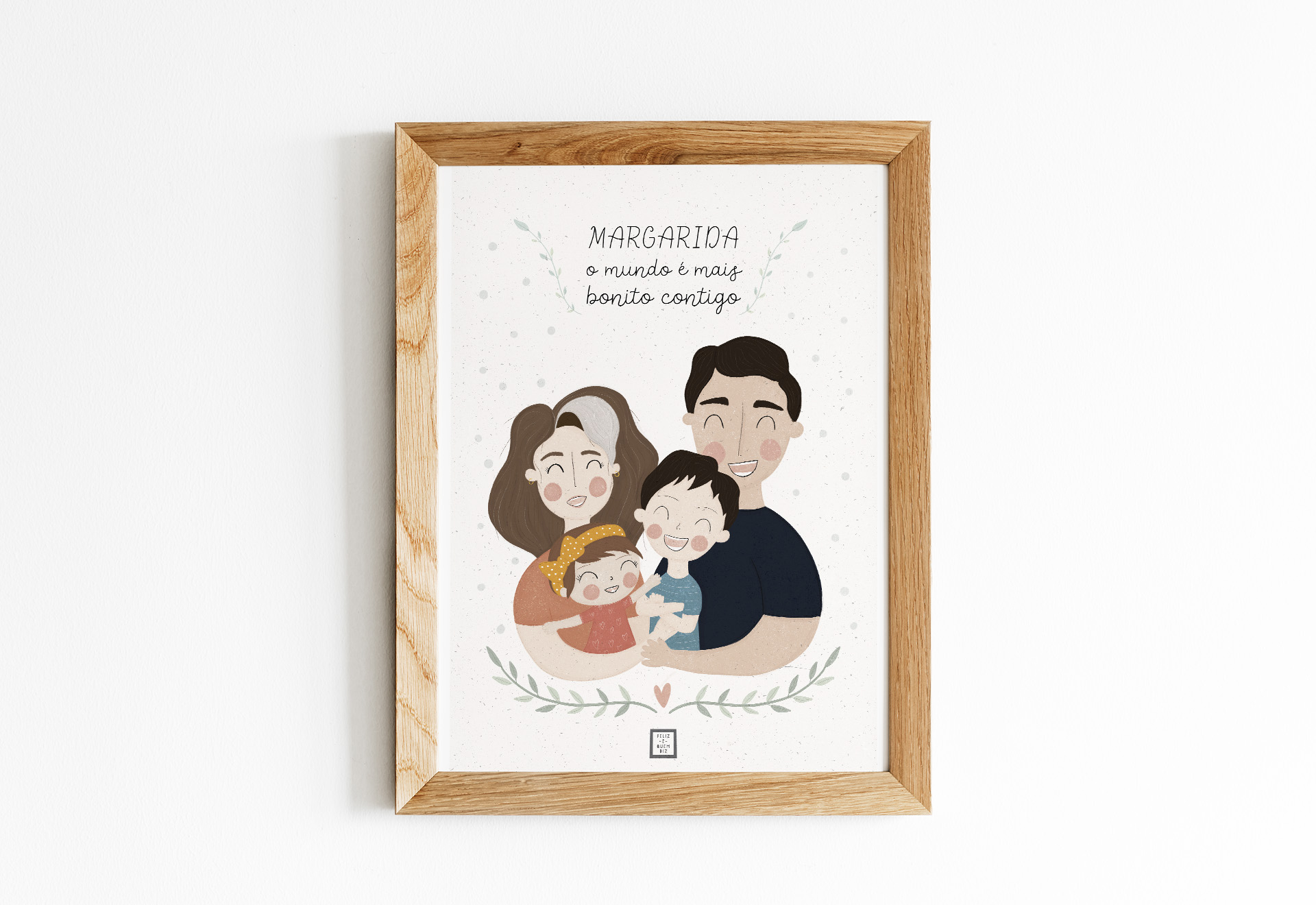 • Pôster ilustrado de família com textos em português num fundo branco e moldura de madeira