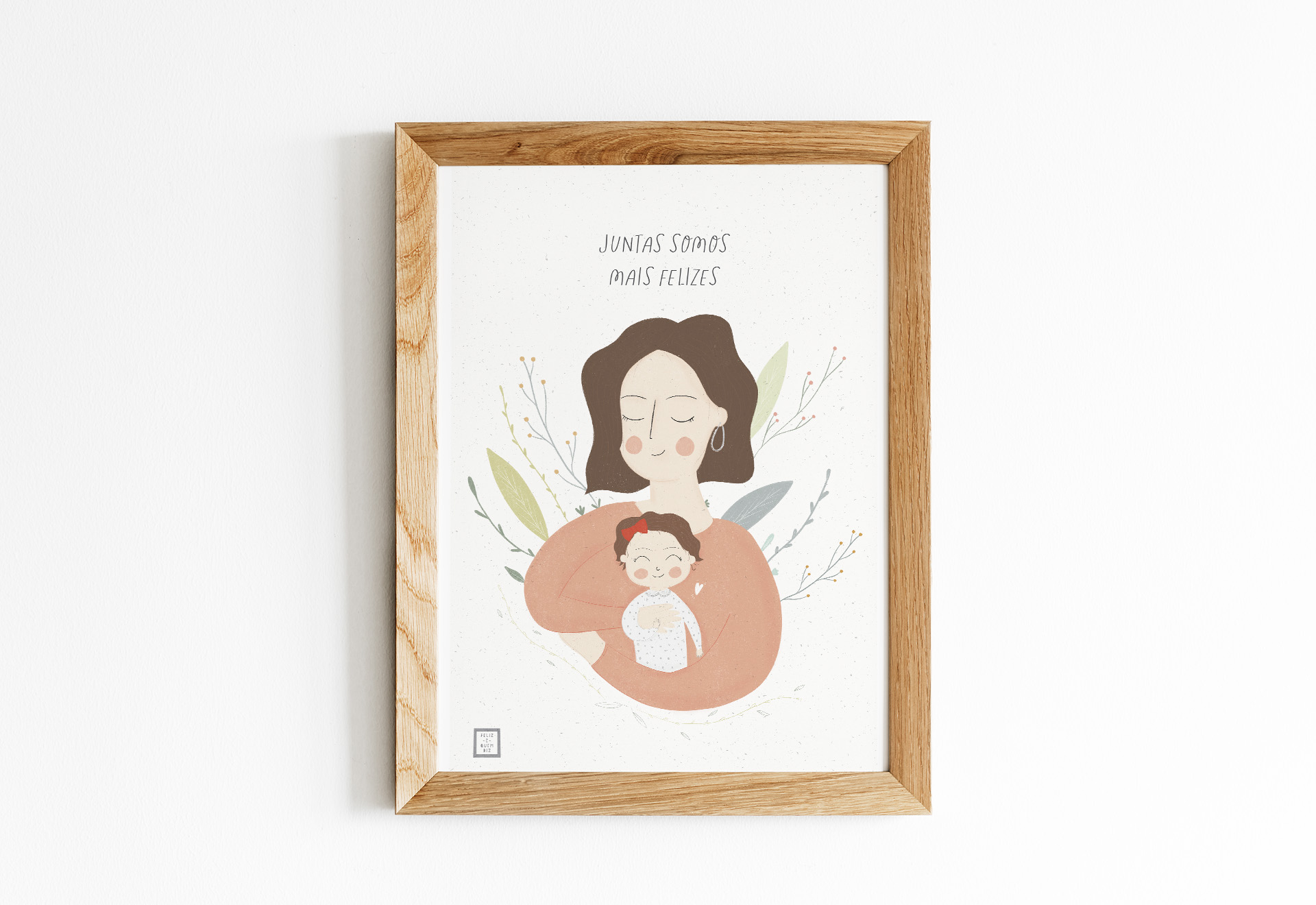 • Quadro com desenho de mulher e bebé com moldura de madeira