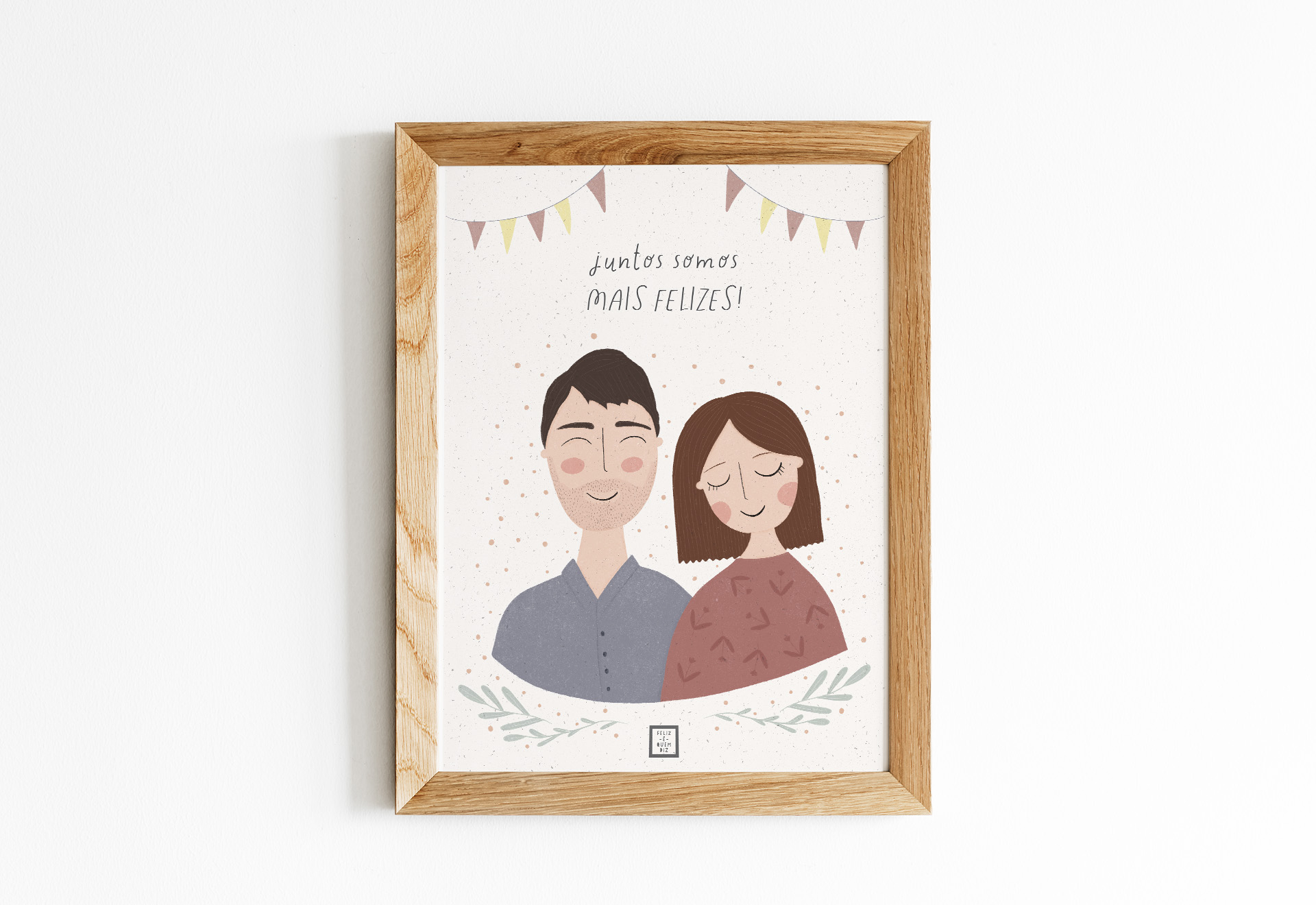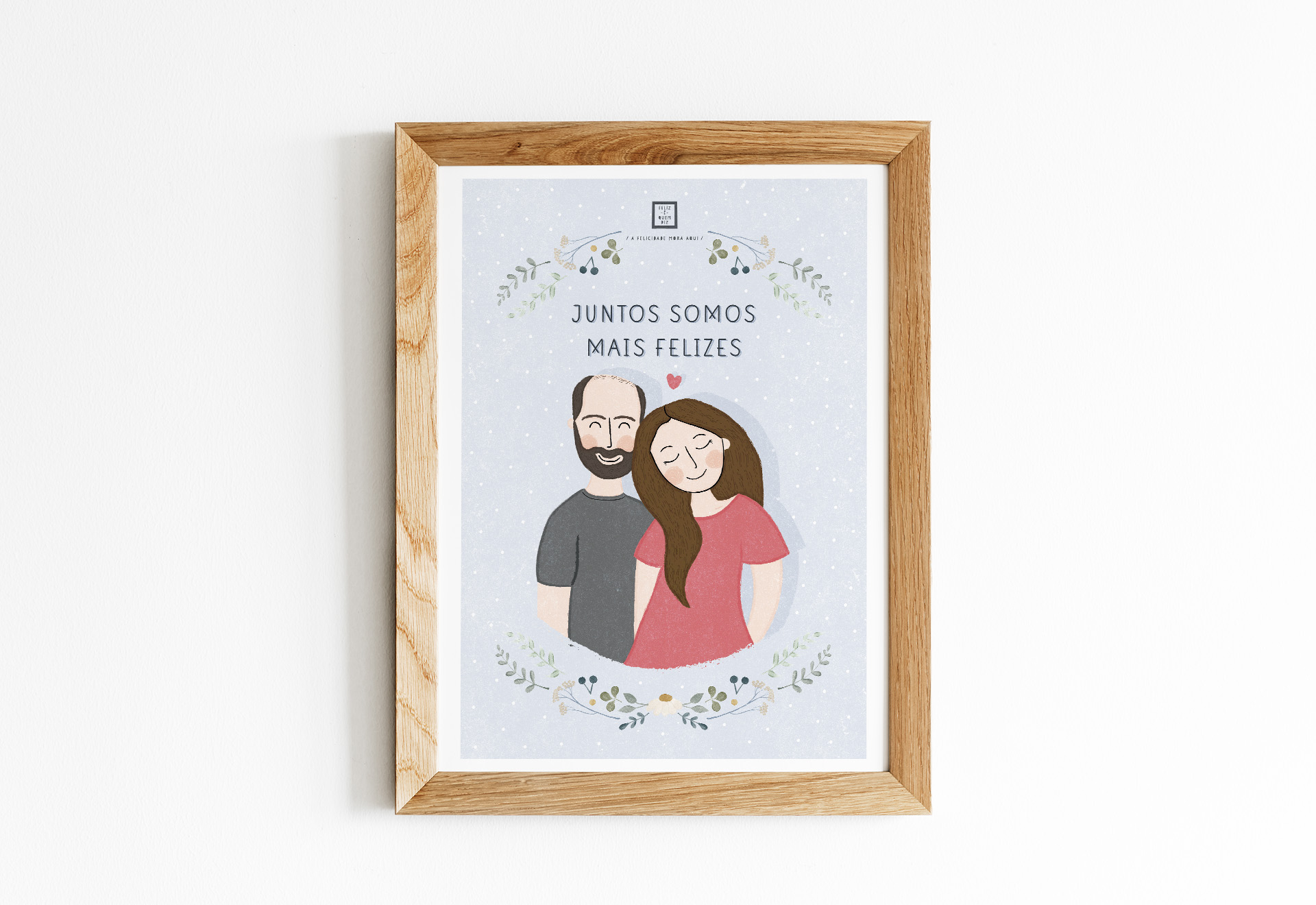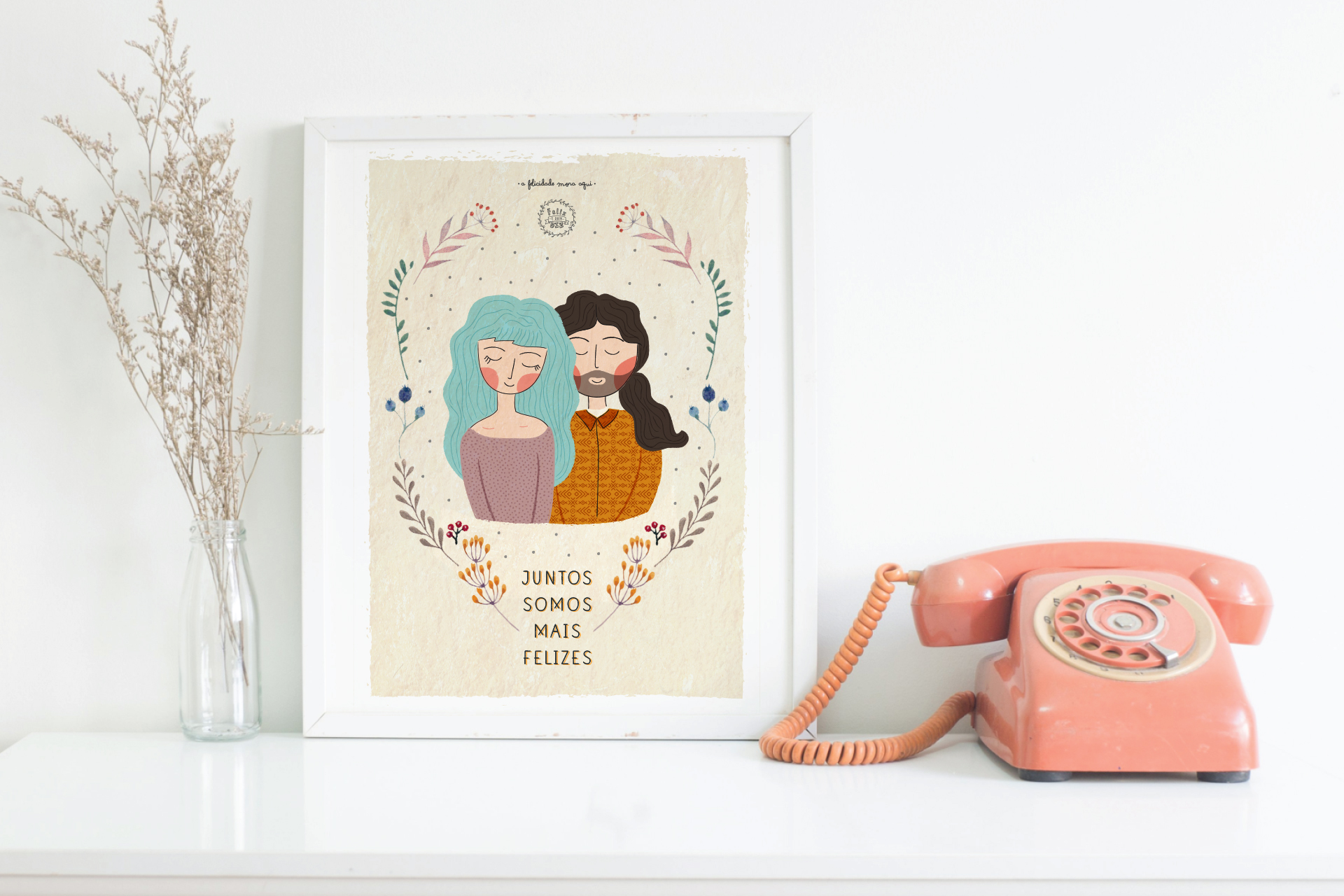 • quadro decorativo com casal ilustrado e texto 'JUNTOS SOMOS MAIS FELIZES'