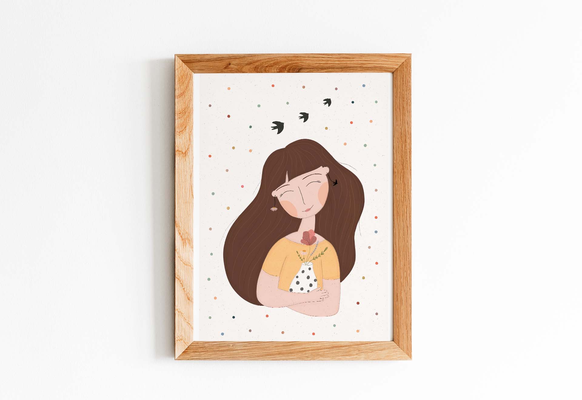 • Quadro decorativo com ilustração de rapariga a segurar uma galinha