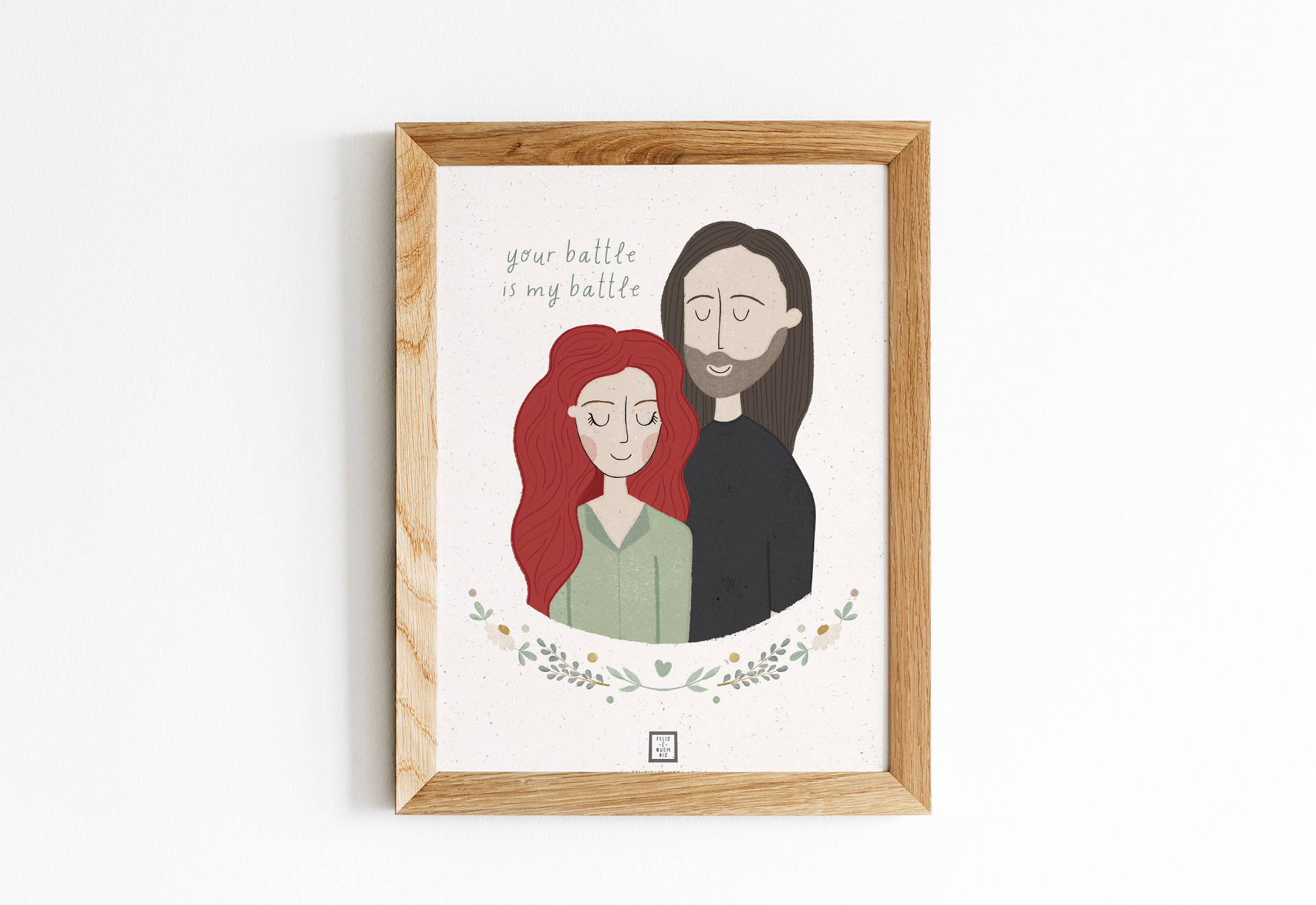 • Quadro com moldura de madeira e ilustração digital de duas pessoas e texto em inglês.