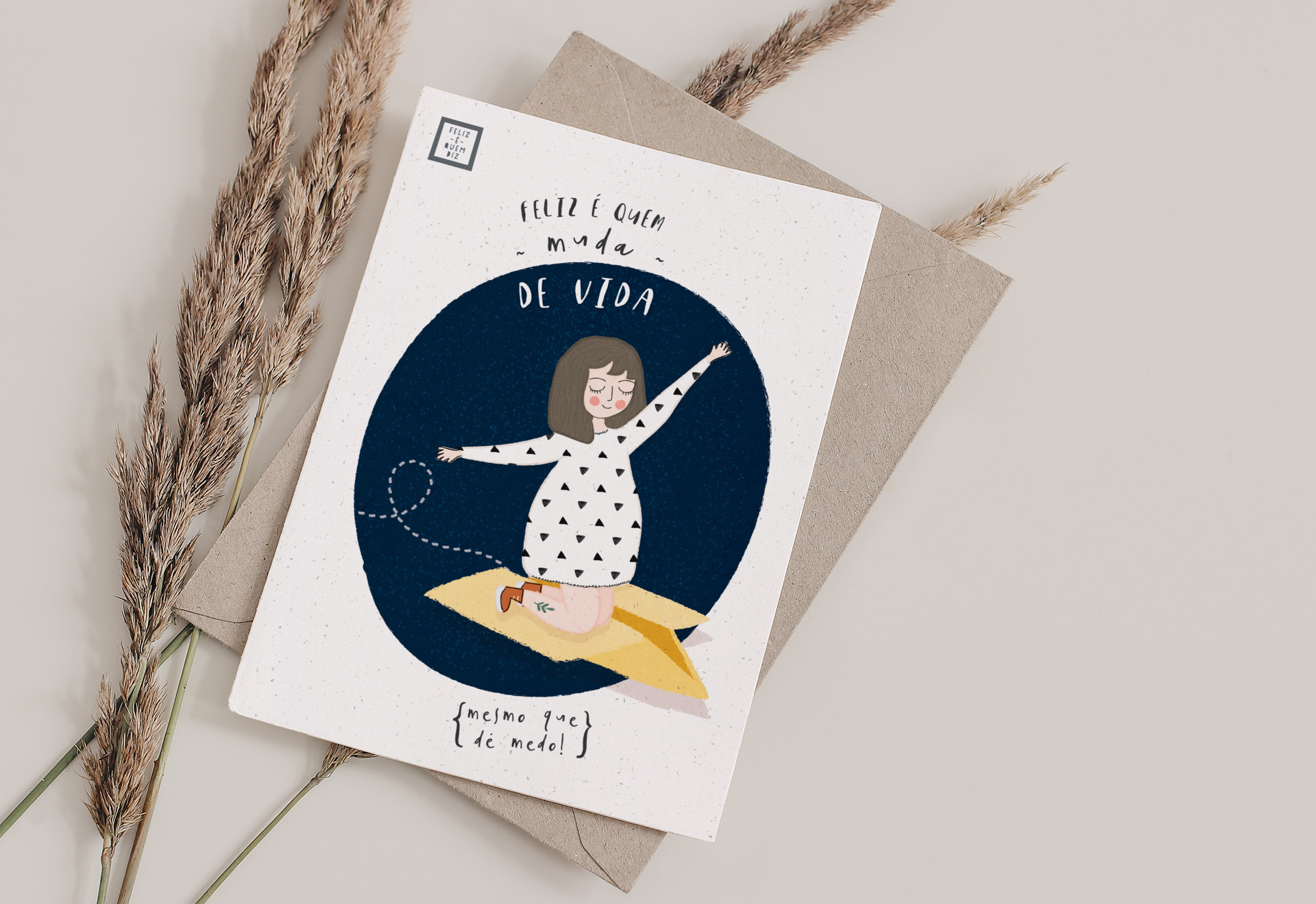 Postal . Muda de vida 1,00 € Desconto de %. IVA incluído. Partilhar Comprar Contactar Ilustração original do projecto Feliz é quem diz® Medida do postal: 16x11cm Os postais não incluem envelope.