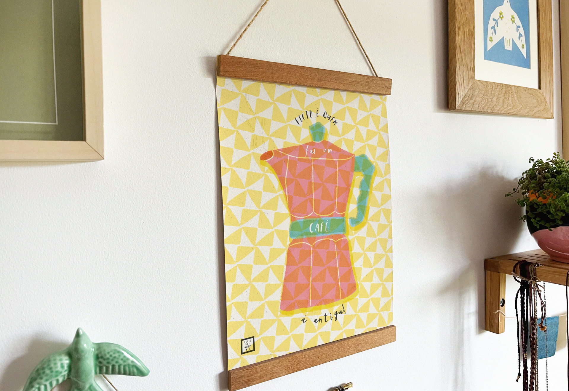 Tela . Café 15,00 € Desconto de %. IVA incluído. Partilhar Comprar Contactar Tela de algodão impressa a cores com ilustração original do projecto Feliz é quem diz® - Tela de algodão 400g. - Formato aproximado A4 (21x30cm) - Suporte de madeira com fio para pendurar - Impressão digital a cores de qualidade superior