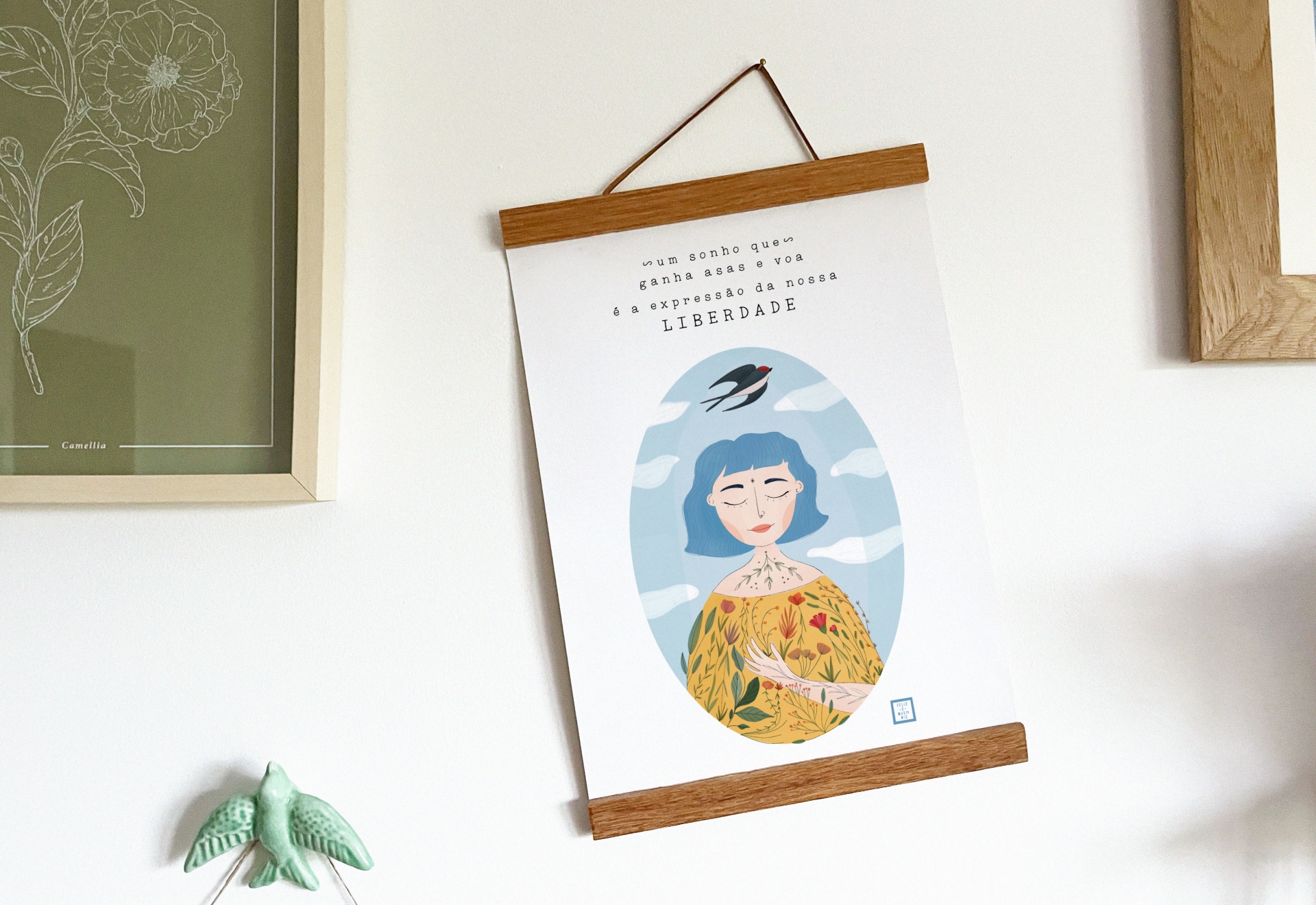 Tela . O sonho voa 15,00 € Desconto de %. IVA incluído. Partilhar Comprar Contactar Tela de algodão impressa a cores com ilustração original do projecto Feliz é quem diz® - Tela de algodão 400g. - Formato aproximado A4 (21x30cm) - Suporte de madeira com fio para pendurar - Impressão digital a cores de qualidade superior