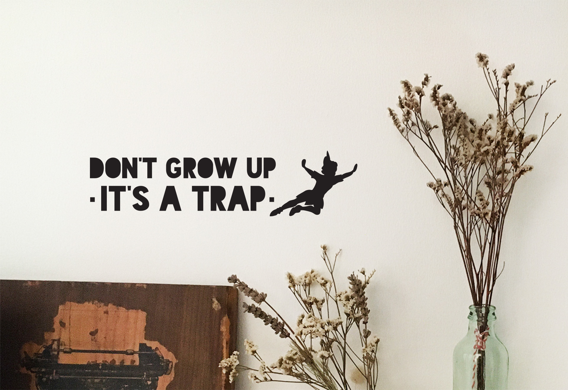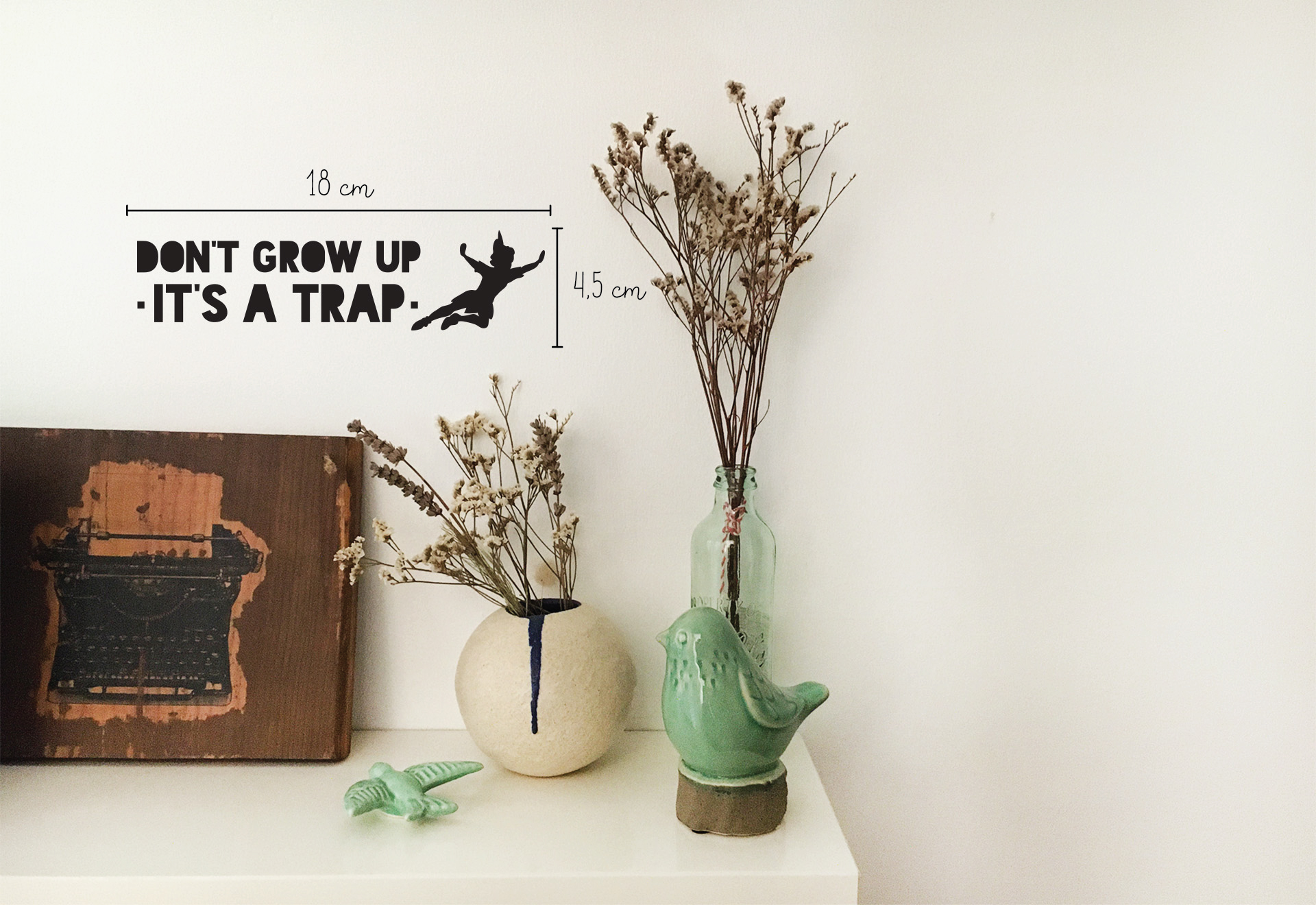 Vinil de parede . Don't grow up 6,00 € Desconto de %. IVA incluído. Partilhar Comprar Contactar Design original do projecto Feliz é quem diz® Frase: Don't grow up, it's a trap Medida da frase: 18 x 4,5 cm Frase em vinil de recorte preto mate para aplicar em paredes, espelhos, vidros, etc. Limpar bem a superfície antes de aplicar. Aplicar com a ajuda de um cartão rígido ou espátula. Inclui instruções de aplicação.